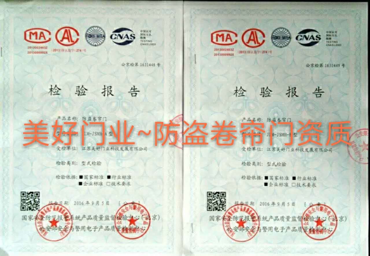 江蘇美好門業科技發展有限公司的兩款防盜卷簾門,日前通過國家安全防范報警系統產品質量監督檢驗中心、公安部安全與警用電子產品質量檢測中心檢測,獲得防盜卷簾門型式檢測報告證書即JLM-JSMH-A型 公京檢第1631448號、JLM-JSMH-B型 公京檢第1631449號,同時獲得國際互認檢測TESTING CHASL 0531.