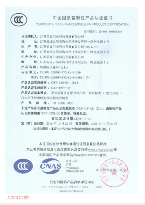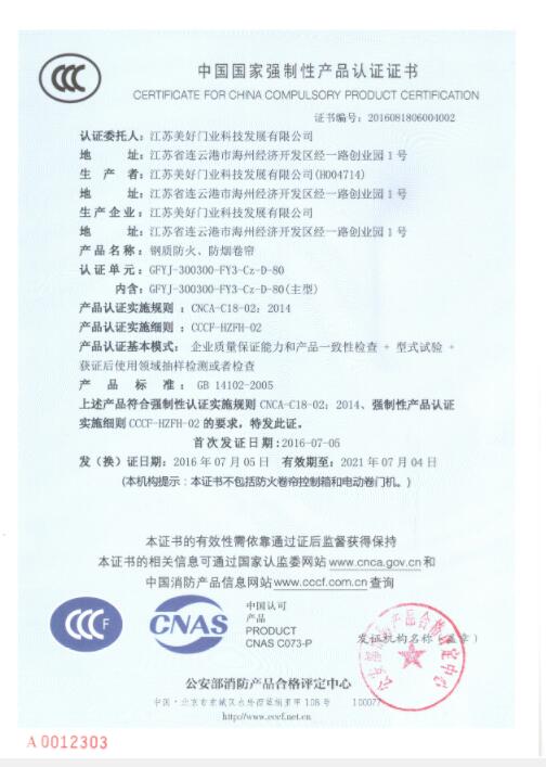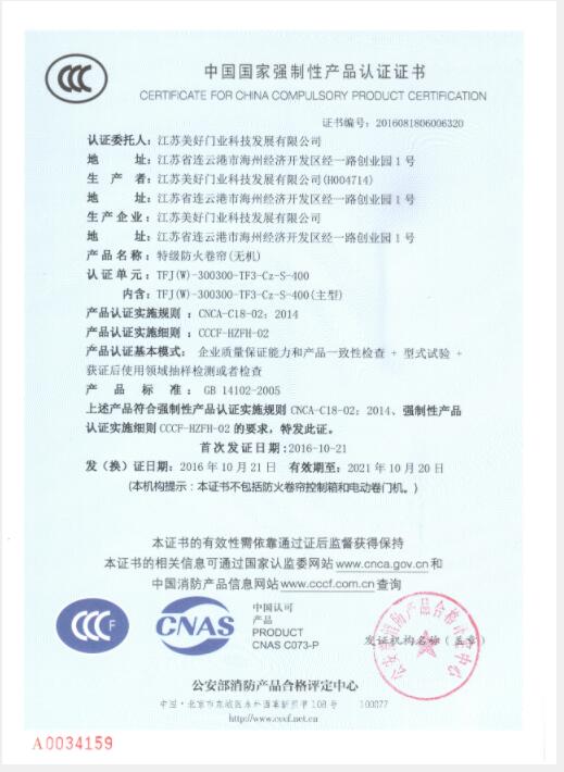 江蘇美好門業科技發展有限公司防火卷簾門順利通過公安部消防產品合格評定中心的檢測并榮獲3C證書