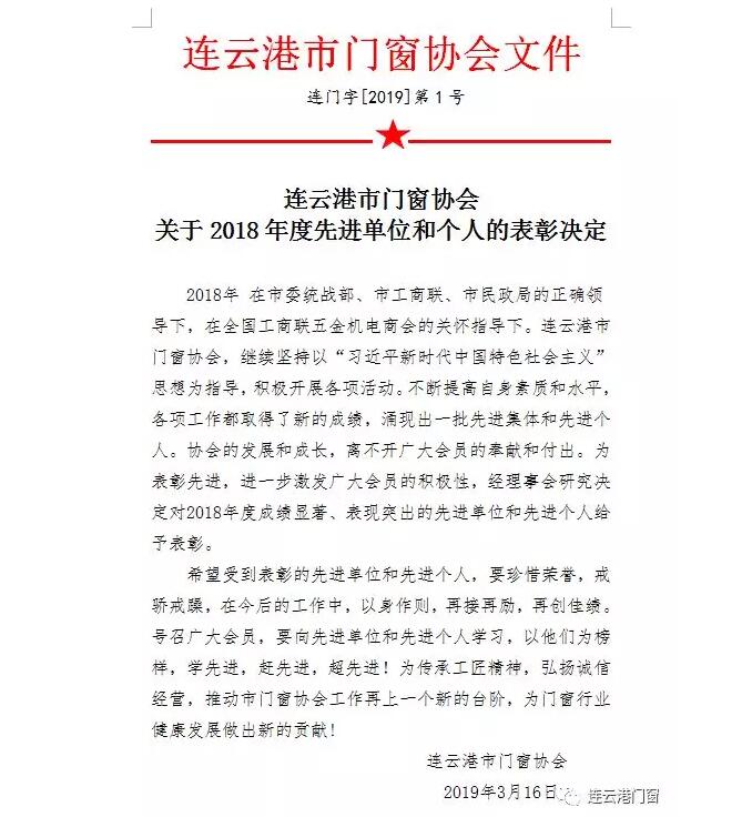 2019連云港市門窗協會表彰大會暨年度慶典3月16日下午在市區“開元曼居”酒店隆重舉行。
