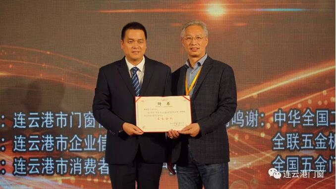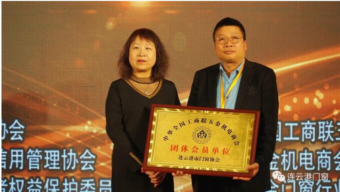 全國工商聯五金機電商會產業發展部主任、建筑門窗委員會秘書長張秀梅女士向連云港市門窗協會秘書長胡啟楷頒發“團體會員單位”銅牌。