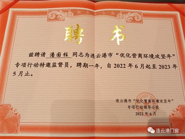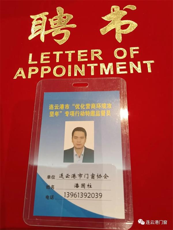 ? ??會(huì)上連云港市門窗協(xié)會(huì)黨支部書記、會(huì)長(zhǎng)(江蘇美好門業(yè)科技發(fā)展有限公司董事長(zhǎng))潘國(guó)柱被聘任為市“優(yōu)化營(yíng)商環(huán)境攻堅(jiān)年”專項(xiàng)行動(dòng)特邀監(jiān)督員。